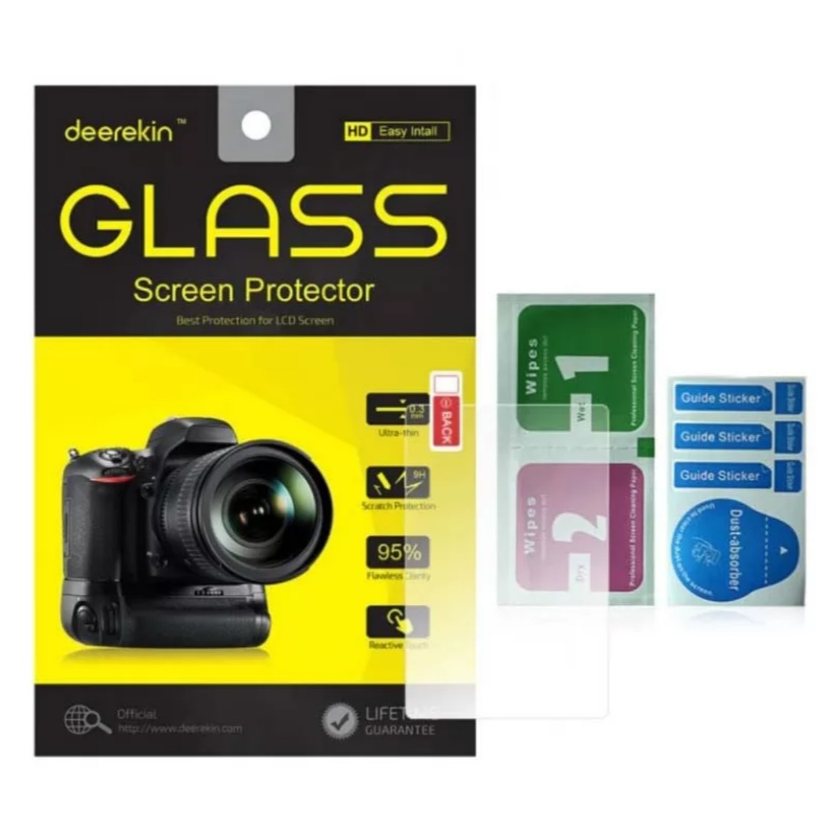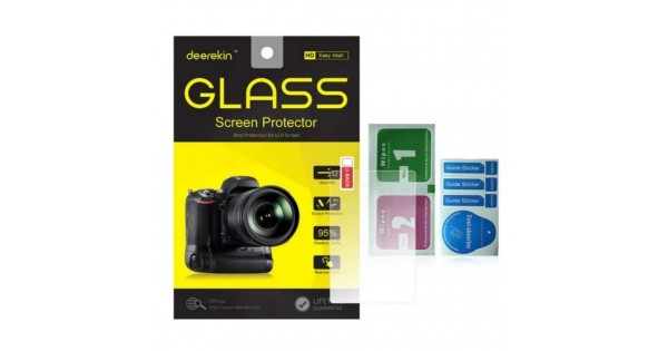 Клейка основа щільно прилягає до РК-дисплею, це виключає появи повітряних бульбашок під захисним склом дисплея дзеркального фотоапарата, можливе багаторазове використання при акуратному знятті скла з РК-екрана фотоапарата. Перед поклейкою захисного скла обов'язково очистіть екран від пилу та бруду серветками, які йдуть у комплекті. Скло фірми Derekin які ви можете купити у нас в магазині має надміцне покриття Gorilla Glass - це покриття краще чинить опір подряпинам і менше залишає відбитки пальців.